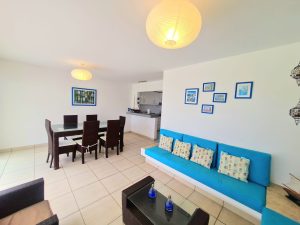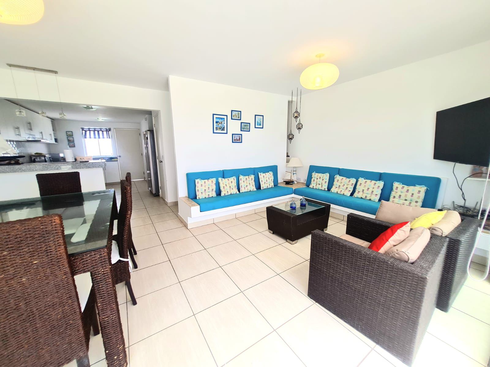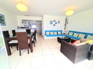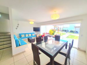 • Sala comedor con mampara y salida al jardín.